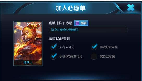 点击【许愿】按钮弹出的面板中,可以先指定好友【许愿】(即以前的索要),选择【加入心愿单】,即可将皮肤加入心愿单;