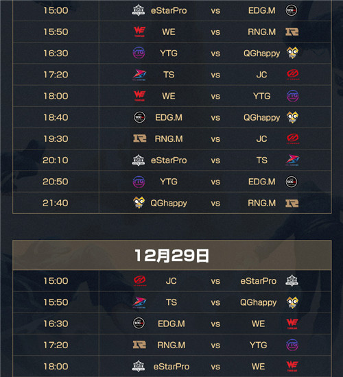 第一阶段(12月28日-12月30日):每支队伍与所有对手交手一次(BO1),最终积分排名前四的队伍进入第二阶段,排名后四队伍淘汰。