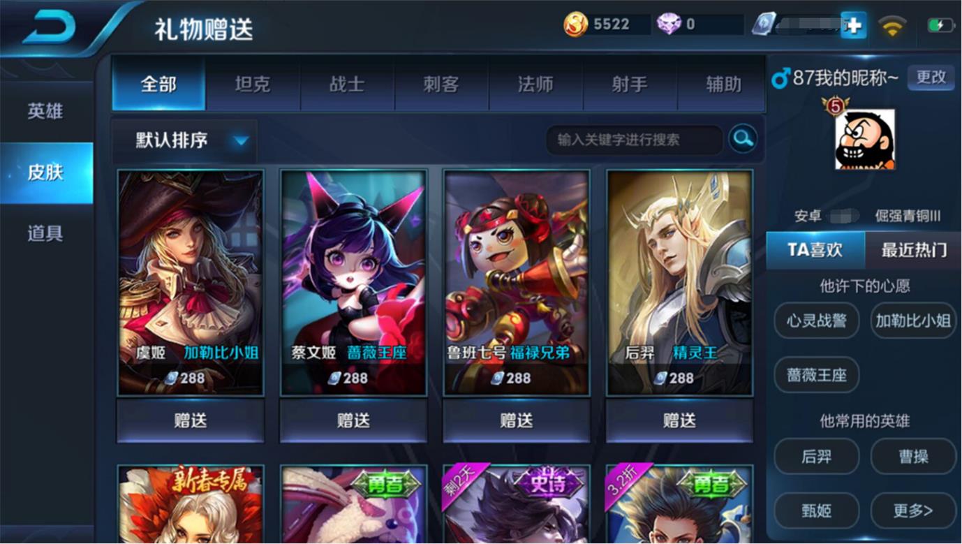 共享英雄的限制: 1、 排位赛中不能使用共享英雄; 2、共享的英雄的范围只包括目前在王者荣耀商城中的“直售英雄”(即不包括SNK系列英雄、武则天、韩信等) 。 温馨提示:亲密玫瑰、浓情玫瑰、朝暮灯使用上限提升至50个/天 (二) 赠礼系统优化 这个版本,我们对赠礼系统进行了一些优化,希望能帮助大家更容易找到好友喜欢的礼物,操作起来能更便捷,具体包含: 1. 赠礼中心礼物赠送界面改版 1) 将赠送和索要两个操作进行了拆分,赠送礼物界面,将好友信息前置,让大家在浏览礼物的时候能快速便捷的找到好友心仪的礼物: 增加了好友的最常用的英雄、心愿皮肤或英雄的显示; 新增了最近最受欢迎的皮肤和英雄的显示,让选择困难症玩家不再苦恼; 增加了关键字搜索功能,输入英雄名字/或者皮肤关键字可以快速找到想要的礼物; ? 轻触好友的心愿皮肤、常用英雄按钮也能快速找到对应的皮肤;