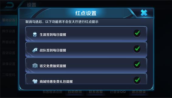 1. 功能入口:设置-基础设置-最底端 2. 使用注意:可以进行手动选择不在大厅进行红点提示的功能,需要重新登录后才可以生效。取消提醒后,用户在进入每个相应模块后仍会进行红点提示。 例如:手动取消勾选“战队签到每日提醒”后,将在大厅的【战队】入口不进行签到行为的红点引导,但用户手动进入【战队】后,仍在战队签到处进行红点展示
