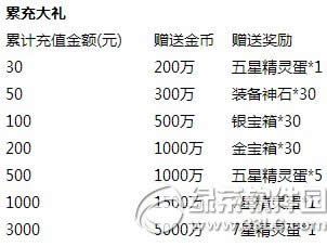 活动二:天天好礼 活动时间:11月24日00:00—11月26日23:59 参与区服: 全服 活动内容:活动期间,玩家每天充值6元,即可获得金币200万和装备神石9个,每天都有好礼! 活动三:累充大礼 活动时间:11月24日00:00—11月26日23:59 参与区服:全服 活动内容:活动期间,每日累计充值达到指定额度即可领取对应的奖励,海量精灵蛋和金币等你来拿! 每个档次每日仅限参与一次!(每天刷新)