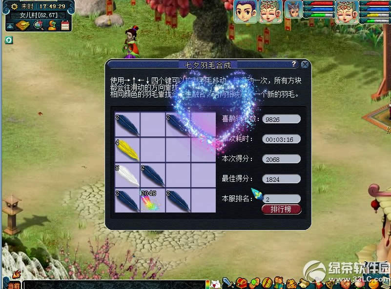 梦幻西游2两情相悦天作合活动介绍: 活动时间 活动期间全天 玩法介绍 活动期间,可以前往女儿村找到一线牵开启俩相悦玩法。 俩相悦玩法可以将通过环任务获得的喜鹊翎毛进行合成,合成高级的羽毛后,使用高级的羽毛进行寻宝将有机会获得更高的奖励。 游戏规则: 1、开启俩相悦玩法的条件:只要拥有的喜鹊翎毛数目>2根,即可开启玩法。但是拥有的羽毛越多,才有可能合成越高级的羽毛。 2、开启游戏后,将在游戏界面上随机出现两个代表数字“2”的蓝色喜鹊翎毛,每次滑动时,随机在空白处出现一个代表数字“2”的蓝色喜鹊翎毛。 游戏中出现蓝色羽毛的总数量=玩家存储在NPC处的蓝色羽毛数量。。 3、当羽毛填满16格无法再次进行移动时,或者拥有的代表数字“2”的蓝色喜鹊翎毛耗尽时,游戏结束。 游戏结束后,发放游戏合成的最高级的羽毛若干根,具体数目以最高级羽毛的数目而定。同时,剩余的羽毛折算成代表数字“2”的蓝色喜鹊翎毛返还玩家。 例如:玩法结束时,屏幕上1个代表数字“2”的蓝色喜鹊翎毛,2个代表数字“4”的红色喜鹊翎毛,2个代表数字“128”的红条翎毛。 玩家将获得:2个红条翎毛的奖励,及5根蓝色喜鹊翎毛的返还。1个红色翎毛=2根蓝色喜鹊翎毛。 获得的奖励及返还的羽毛将全部存在NPC处。 4、出现最高级的七彩羽毛(代表数字“2048”的羽毛)后玩家可以继续游戏,两个七彩羽毛无法再次合成,每多合成1根七彩羽毛,奖励结算时,多发放一根七彩羽毛。 5、游戏过程中,可以使用上下左右键控制游戏界面内物品的移动。每次可以选择上下左右其中一个方向去滑动,每滑动一次,所有的代表羽毛的方块都会往滑动的方向靠拢,同时,系统也会在空白的地方随机出现一个新的羽毛。 当拥有的代表数字“2”的蓝色喜鹊翎毛耗尽时,游戏的空白处不会再出现新的羽毛,此时游戏将提前结束。 6、相同数字的方块在靠拢、相撞时会相加,具体数字对应规则见下图表: 羽毛及其代表的数字对应如下: