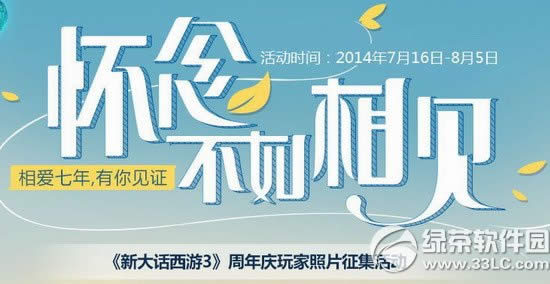 新大话西游3怀念不如相见活动: 活动时间:2014年7月16日-8月5日 时光易老。七年光阴,大话3陪伴你一路走来,那些嬉笑怒骂、风衣怒马的日子,已成为你时光簿里的一张张老照片。翻开你的时光簿,让我们一起分享那些永不褪色的美好记忆。 登录页面,填写游戏昵称、ID、服务器名等必要信息后,上传你与大话3七年相伴的照片,包括但不限于: (1)游戏截图:2007-2014年间游戏里的截图,如聊天互动、精彩战斗、值得定格的时刻等。 (2)真人照:手持"相爱七年"字样的真人合照,可以是手写、电子屏幕或其他形式。 (3)历年见面会照片:玩家在见面会上的合影(或玩家之间自发组织的聚会)。 玩家可在照片下"点赞",人气数将作为最后官方入选照片的参考,但非决定性因素。 活动奖励 (1)开发组将从上传照片中挑选部分经典照片,用于2014年8月15日晚20点的"相爱七年"游戏内活动现场播放,入选照片的玩家可获得大话3 "相爱七年"周边大礼包一份。(大话3宓罗抱枕、大话3宓罗钥匙扣、大话3宓罗主题卡贴、大话3宓罗手机贴、大话3海王T恤)