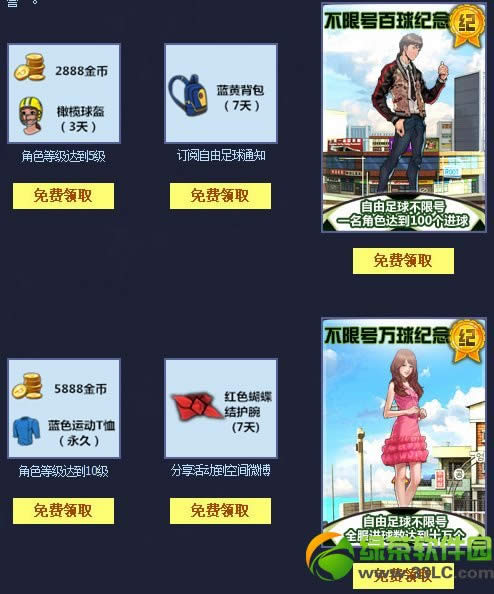 荣誉说明: 荣誉将同步在QQ展示,您可以在游戏人生和QQ面板秀给您的好友【设置】 活动规则: 1、请先注册自由足球角色,并在游戏人生绑定 2、礼包和道具以CDKey的形式发放,您可以在“我已领取的礼包查看和兑换” 3、活动期间纪念荣誉不能手动领取,待6月8日活动结束后统一发放绝版纪念荣誉。 4、全服进球定义:活动期间内所有玩家在所有服务器进球的总数累计。 自由足球怎么踢都型活动地址:点击进入