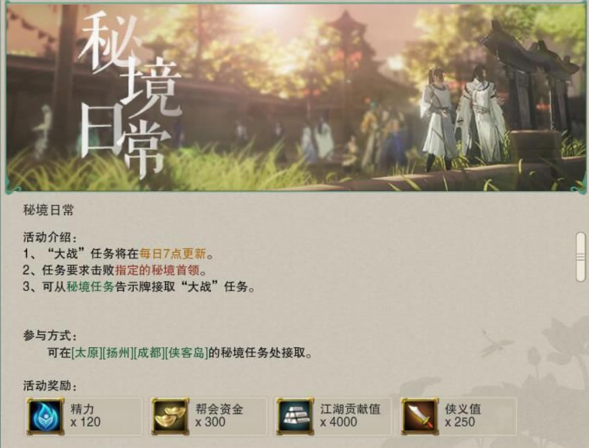 PVE则是玩家挑战各种副本,虽然说每天重复打BOSS并没有与玩家PK爽,但打BOSS掉装备、挂件、坐骑、宠物以及各种珍稀材料,一旦掉落好东西,就能分到一笔不菲的工资。因此,PVE玩家都比较有钱,在不买外观的情况下,自给自足是完全没有问题的,甚至连点卡都不用充钱。而如果想往PVE发展的话,自然就需要做PVE日常任务,这些日常任务可以获得江湖贡献值和侠义值,用来兑换帮贡装。毕竟,刚满级的时候,身上还是一套任务装,进副本战力太低,起码也得先弄一套帮贡装才好进。