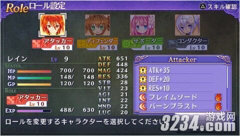 职责的等级:左下方四个不同颜色的图标表示职责等级,战斗后角色得到的经验不仅会加在角色等级上,也会有同样数量的经验加在该场战斗角色担当职责的等级上(同一角色4个职责的等级经验是分开计算的)。