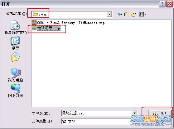 4.找到刚才的roms文件夹,选择一个想玩的游戏,比如:最终幻想,然后单机右下角的打开就可以玩游戏了^_^~~~如图: