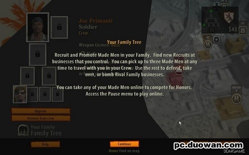 雇佣之后,按下Tab键可进入老板视点进行查看。首先看到的会是家族树。你可以招募好汉或者晋升家族中的好汉。你能够在归你控制的生意处找到新成员。在任何时候你都可以带上三名好汉作为你的手下行动。其他人可用作防御本家族生意,或者去攻占甚至是炸掉敌对家族的生意。你还可以带上你的好汉去线上赢得成就,在ESC键呼出的暂停菜单中可进行登录。
