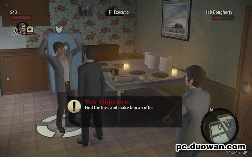 首先是要与麦克·柯里昂谈话。由第一个任务可见《教父2》是个难度极高的游戏,第一个任务就足以让《教父》的忠实拥趸摸索半天。麦克·柯里昂在哪?经过数十分钟的寻找与否定之后,终于无奈地接受眼前这个相貌平庸的男人即是“麦克·柯里昂”的事实。好吧,继前作中无法取得阿尔·帕西诺的声音使用权之后,本作中连形象使用权都没了。言归正传,在游戏中,走到人物面前按E键即可与之谈话,其中,与特殊人物的谈话会有字幕乃至动画,而与龙套角色的谈话则只会有声音。与前作相同,目标人物的头上会出现图中这个经典的标示。尽可能贴到“麦克·柯里昂”的身上按E键与之对话吧。
