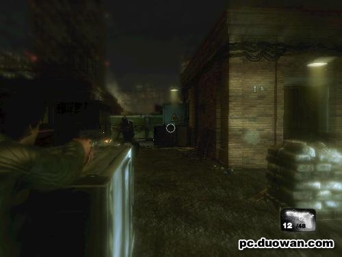 这关给我感觉流程比较短,而且刚开始的场景极像COD4的某地图,开始可以利用棺材和废车暗杀一名敌人,其实就算暗杀也会引起中间那几个谈话人的注意,杀完这几个人后,如图的盾牌兵出现,我多次利用抛物线子弹也未能将其杀死,所以我怀疑他是打不死的,就往主角右边的那条路走,进门触发剧情