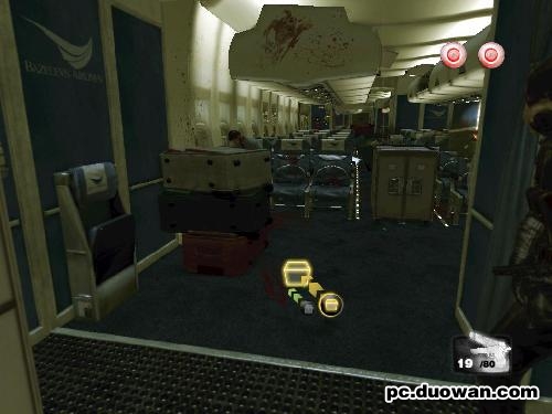 在机舱中用抛物线子弹打掩体后的敌人很浪费时间,射击消防瓶就可以了