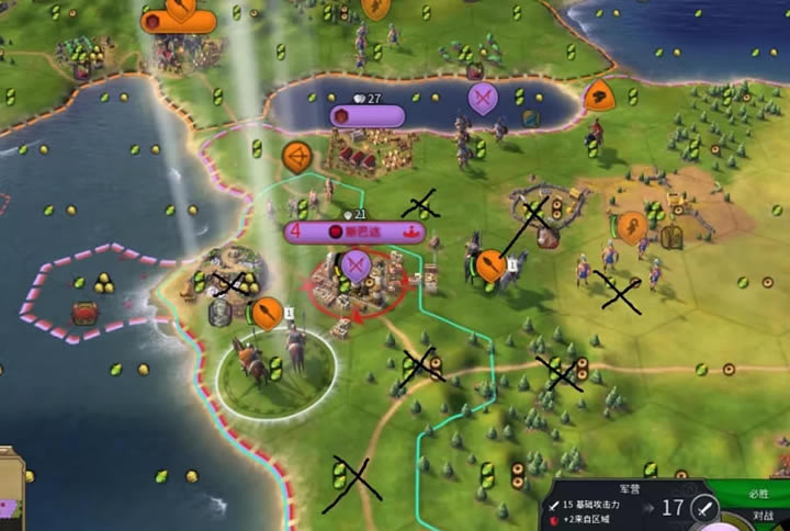 最后山脉格是直接算到控制区域的,海洋格则需要海军来控制 2、城市防御力: 城市防御力是最强近战兵种力-10和驻军战斗力两者中取最高者,加上区域数量以及人口加成 城市攻击力是由你当前所有远程攻击单位中远程攻击力最高而决定的,等于该数值 以上算法很复杂,我也没搞太清楚,所以可以忽略,直接看经验结论: ①每个区域会给城市+2防,所以下城前先劫掠区域可以减低攻城损失; ②市中心驻扎军事单位会加防(近战驻扎城内加的防御力一般比远程大,具体数值算法比较复杂,不太懂,但是一般还是要远程驻扎城内,防止被集火秒杀)。 引申:那防守时我知道把单位驻扎城内,那进攻时AI单位驻扎市中心怎么办?这里又有一个技巧,可以利用工人或者移民勾兵: 把你的陆军单位放在一般远离市中心两格,派一个工人去市中心边上,基本上AI都会把城内的单位出来抢你的工人,这时候你再集火秒杀,工人也抢回来了,下一个城继续用。中期一个单位出来可能会降低十几点城防,这还是很关键的 3、如何有效下城: 下城一般分为四种情况: ①无城墙:无城墙就可以利用上述所说劫掠加勾兵来降低城防,围城配合远程近战骑手下城 ②有城墙(非文艺复兴):有城墙后小马基本上踢不动了,但是小马还是有用的,等到升级追猎者用来劫掠AI(野蛮6那叫一个爽),攻城大任则交给了石弩和火枪手+攻城塔;如果难度低可以打一波石弩+追猎,难度高的话就推荐火枪+攻城塔更稳定