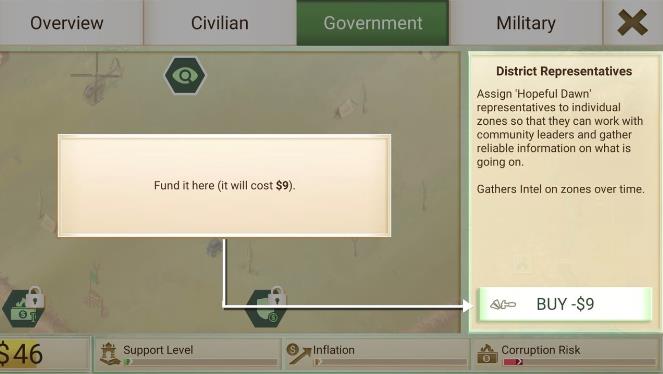 快速实行大量类似的举措会引起通胀,这会让一切变得更贵。如果通胀太高,你可以等它自行消退或者尝试资助不同领域的举措。点叉回到主地图。