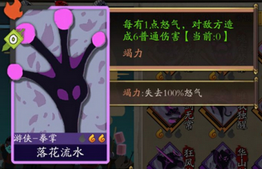 点评吐槽:隐藏武学之耻出现了……黄老邪的武学提起来,笔者个人觉得还是一曲碧海潮生啊,落花流水这东西……效果是消耗全部怒气打伤害,显然是爆发卡,然而数值感人,完全不够看,升星加伤害,升级竭力效果变成消耗一半的怒气,然而游侠是怒气极度紧张的职业,落花的伤害与怒气消耗不成正比。另外是你吗?蛇鹤八打失散多年的兄弟?噗,总之实在太丢人了……稀有度橙卡,进一步拉低了评价