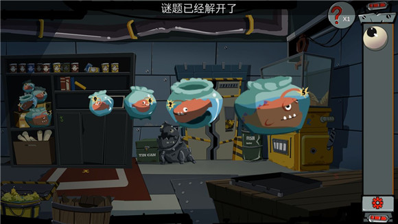 把水龙头安装在桶上点击木桶,获得一个眼球刻刀在左边书架上,用刻刀在面包机上挖出缺口,点两下拿到第二个眼球。似乎可以给狗安上。获得钥匙。打开罐头箱子…拿到一个圆环(?)