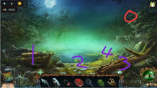 7、捡起1火柴,拿下2油灯,挂到3鹿的嘴上,用火柴点亮。拿下鹿角上的弹弓,在4筐子里翻找到手柄,把手柄放到5柜门上,打开柜门,拿起螺丝。
