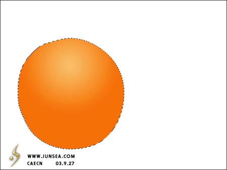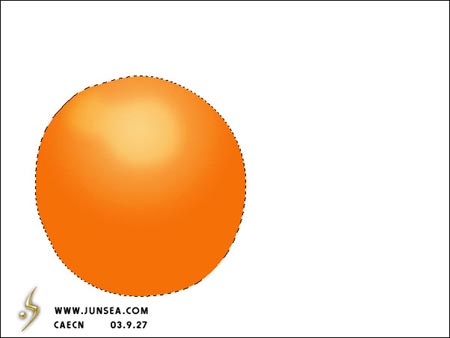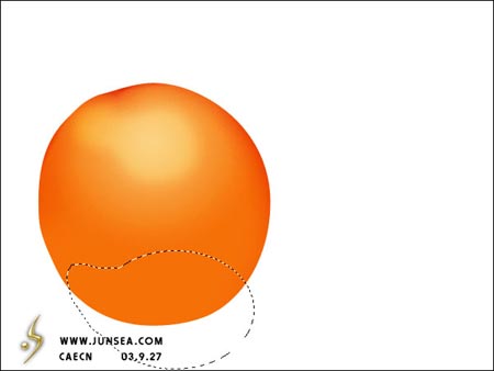 图56.现在的橙子看起来还是缺乏立体感,我们再来给它加一个受光面,也许那样看起来会更有立体感,假设光是从底部向上照明,(且照明的灯光颜色为白色)那么我们就该把橙子的底部也作为受光面来处理,用椭圆选框工具将橙子的底部框出来,再用套索工具将它的形状做修改,(图6)将选区羽化20个象素,并重复两次羽化。
