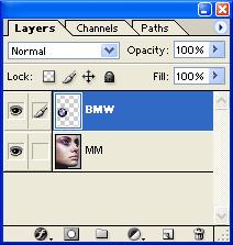 还可以按下Ctrl+T键,调整标志的大小。该文件自动增加一个图层,将该图层命名为“BMW”,原图层命名为“MM”(如图04)。