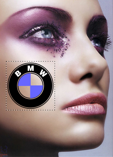 可是这时候的标志只是覆盖在MM面部的上方,并没有沿着面部的曲线发生变化,而且好像是粘上去的,没有皮肤的质感。不要急,我们这就让它服服帖帖的贴在皮肤上。使用矩形选择工具,在宝马标志周围画出一个矩形选框,一定要将标志全部包括进去(如图05)。