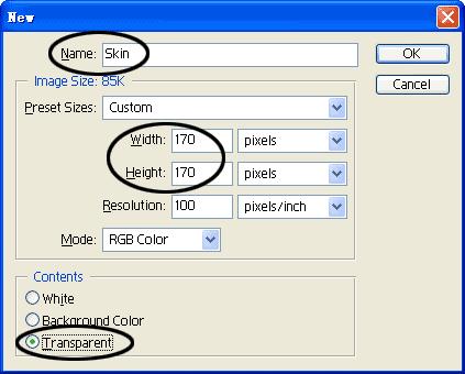在Layers面板上选择MM图层,按下Ctrl+C键,复制MM在选框内的皮肤。然后选择菜单命令File→New,在新建文件对话框内,将文件命名为“Skin”,选择Contents为Tranparent,长度和宽度保持不变(如图06)。