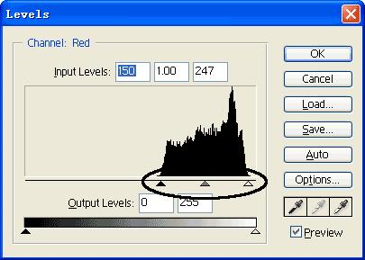确保“Skin”为当前窗口,选择Channels面板,单击Red通道,该通道被选择,文件窗口中变为灰度图,因为此时的文件只包含红色通道的信息。选择菜单命令Image→Adjustments→Levels,在色阶调节对话框中将输入区域的黑白滑块向中间拖动(如图08),这就使得该通道中的明暗对比更加强烈,也就是面部的曲线更加明显了。