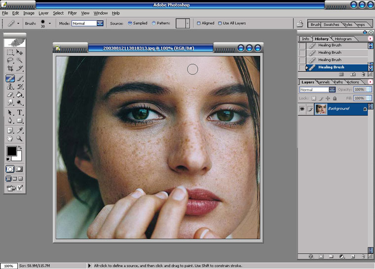 1.打开图片,用修复画笔工具按住ALT键取样点击,先修复一块额头区域。
