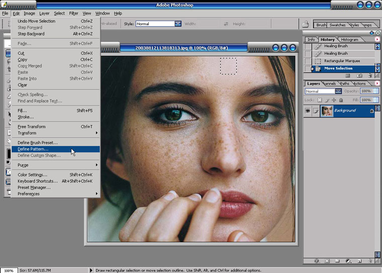 2.用矩形选区工具按住SHIFT键画一个矩形的选区,选定修正过的皮肤区域。在Edit(编辑)菜单下选择Define Pattern(定义图案),在保存对话框中按下确定按钮保存。