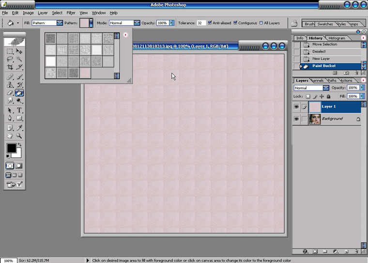 3.新建一层,用油漆桶工具,在状态栏上Fill(填充)选项中选择Pattern(图案),在图案下拉框中选择刚才定义的图案,点击画面完成填充。