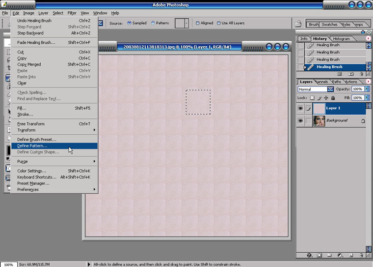 4.初步定义的图案接缝比较明显,画一个矩形选区在图案接缝处,用修复画笔修复拼接痕迹。再次定义图案。
