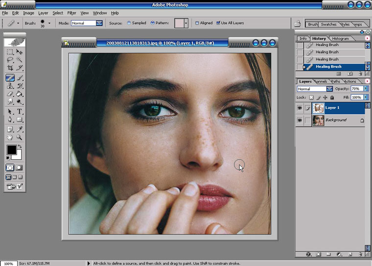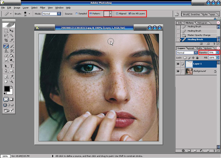 6.在图层1上,CTRL+A全选,然后按DEL键删除,CTRL+D取消选区。用修复画笔,在状态栏上,选择Source(源)为Pattern(图案),选择最后一次定义的无缝图案为图案源。勾选Use All Layers(作用于所有图层)选项。在图层1上,用修复画笔涂抹,记住!直接涂抹,不需要再按ALT键点击取样。我们惊奇地发现,带有图案的修复画笔成了很神奇的修复工具,在去除斑点的同时保持了一定的皮肤纹理。因为修复画笔不能设置笔刷不透明度,所以我把图层1的不透明度降为70%,让修复效果更加自然。