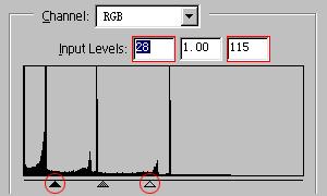 此刻的灰度图像中,文字与背景在亮度上有了显示的区别,但仅仅调整亮度/对比度还不能清除背景中某些颜色稍深的区域(而且把对比度被调得太大,很容易让文字或徽标出现毛边)。用 Image(图像) > Adjust (调整)> Levels (色阶)命令调整图像的色阶可以轻易地解决这一问题。我们设定两个“阀值”,如果灰度图像中某个像素点的亮度大于第一“阀值”,我们让这个点变成白色 RGB ( 255 , 255 , 255 ) ;而如果灰度图像中某个像素点的亮度小于另一个“阀值”,我们把这一点涂成黑色 RGB ( 0 , 0 , 0 ) 。通过这样的处理,图像中的颜色数目将大大减少。在处理文字或徽标的源图像时,如果两个“阀值”取得比较接近,我们甚至可以让文字变成纯黑,而文字以外的区域全部变成白色--这非常适合我们用魔术棒工具 ( Magic Wand Tool ) 精确地选取图像中文字或者徽标。在调整图像色阶时,图中标注的两个参数就充当了这两个“阀值”的角色。你可以直接修改 Input Levels 参数,但更合理的做法是勾选 Preview 复选框,一边调整设置窗口中的三角形滑块,一边观察图像的变化。