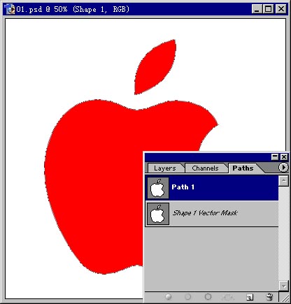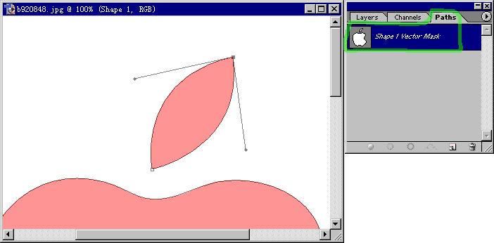 接着画柄(叶?),此时一定要记得将和集按钮勾选上:)我拷屏时有些失误:(转到路径面板看看你画的苹果和叶柄是否在同一失量蒙板路径中。