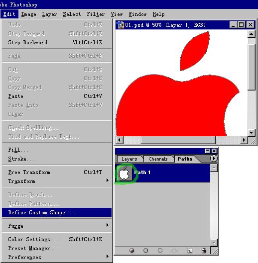 选择刚才存贮的路径(此时画布上能看到路径),如图所示将其定义为形状。