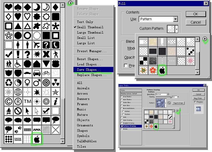 此时你可以在这些地方很方便地调用该形状,如图。可将其存贮下来,图中左击我打勾的地方都能将形状存贮下来以备日后之需。(形状文件后缀为.csh,存放在PS目录下的peresetscustom shapes中,可将其拷出备份,软件升级或重装时可放回相应目录,新的PS便能调用。)