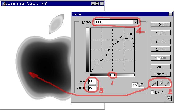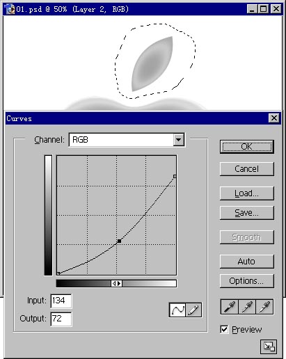反色(Ctrl+I),拷贝后粘帖到一个新图层。有两种办法(也许通过图层效果也能达到,但比较麻烦,难得调整数值)来实现我们看到的苹果标志的那种因为边缘较薄而形成的"透亮"的质感。第一种方法:按Ctrl+M调整曲线,如下图示,这样做主要是为了得到边缘色阶的层次。