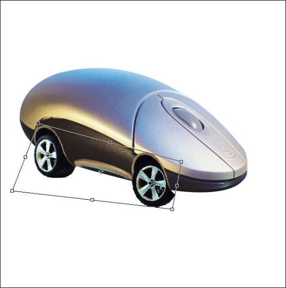 5.经过前面步骤中的拖拉后,后车轮显得有点过于宽了!这不符合实际的透视原理,因此,我们可用钢笔将后轮过宽处勾出,转为选区,并将选中部分删除(图6)。