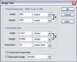 这张照片是从数码相机中取得的,它的尺寸有1920x2560像素。如果图像的尺寸太大放在网页上会造成下载速度很慢,因此我们需要修改图像的大小。执行Image〉Image Size,并且重新指定图像的大小。我把图像缩为300x400像素。
