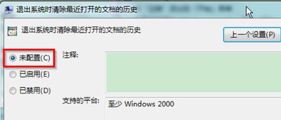 3、在右侧窗口中双击打开“退出系统时清除最近打开的文档的历史”,选择“未配置”。