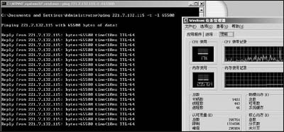 Windows系统带来严重的后果,那就是Ping入侵即是ICMP(Internet Control and Message Protocal是因特网控制消息错误报文协议)入侵,原理是通过Ping大量的数据包使得计算机的CPU使用率居高不下而崩溃,通常在一个时段内连续向计算机发出大量请求而导致CPU处理不及而死机,如图所示。