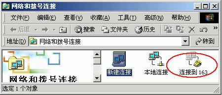 用鼠标右键点击打开位于桌面上的"网上邻居"的属性项。除了新建连接外,你会看到有两个连接:一个是本地连接,用于本机的网卡;另一个是上网设备的连接,在本例中为使用Modem的163连接。