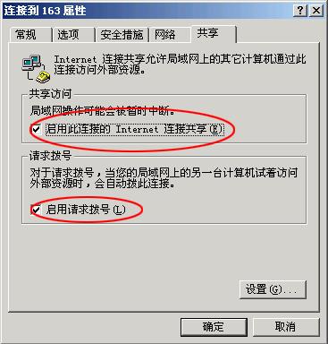 网络和共享选项,目前只会用到共享这一项。在共享项的设置页面,选中共享访问中的"启用此连接的Internet连接共享",同时保持"启用请求拨号"默认选中的属性。这样,局域网上的其它计算机可以通过直接打开浏览器的方式自动触发拨号,而无须在上网前跑到上网服务器先行手动拨号。不过,记住在上网帐号的设置选中了保存密码。