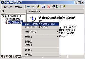 (2)开始配置:要想让Win2K计算机能接受客户机的VPN拨入,必须对VPN服务器进行配置。在左边窗口中选中"SERVER"(服务器名),在其上单击右键,选"配置并启用路由和远程访问"。
