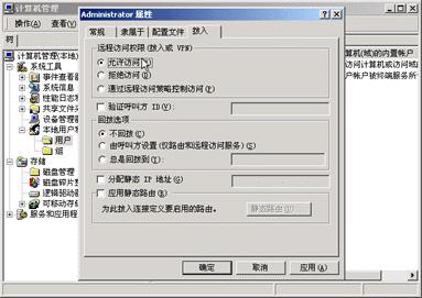 (2)欲给一个用户赋予拨入到此服务器的权限,需打开管理工具中的用户管理器(在"计算机管理"项或"Active