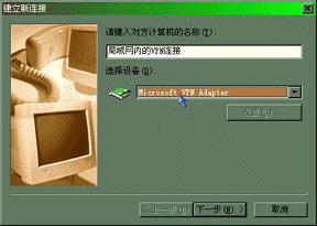 网络"中,双击"建立新连接",然后在"请键入对方计算机的名称"输入连接名,比如为"局域网内的VPN连接",在"选择设备"下一定不要忘了选中"Microsoft