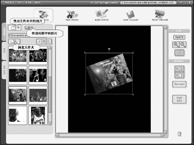 点击主界面上方工具栏中的“Add Pieces”按钮,进入图片添加界面(如图1)。选择左侧的“Images”标签,点击其中的“From File(使用文件夹中的图片)”项。然后利用“Browse”按钮,导入需要用到的图片。点击“From Album(使用相册中的图片)”按钮,可以把硬盘中的图片制作成相册保存到软件中,以便调用。最后在列表中的图片上按住鼠标左键,将其拖动到工作区。使用其上的控点可对图片进行旋转、缩放操作。