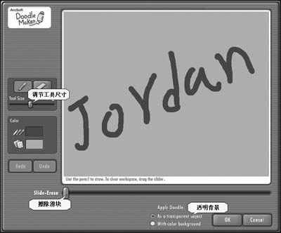点击工具栏上的“Make Pieces”,选择“ArcSoft DoodleMaker”,可在弹出的数字画板上(如图3)画出各种各样的图画作为独有的签名;选择“ArcSoft Letterboard”两个按钮。可为拼贴画添加艺术字母。