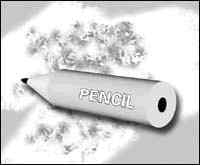3. 再新建一个图层,使用“椭圆选框”工具绘制一个椭圆选区,用黑色进行填充,调整其大小后拖动到笔杆末端作为铅芯,然后使用相同的方法绘制笔尖,效果如图2所示。
