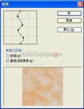 三、 选择菜单栏上的“滤镜—扭曲—切变”,在弹出的对话框中拖动手柄,使底纹扭曲。(图二、图三)