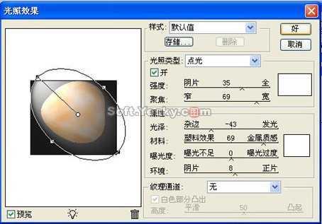 七、 使“图层1”为当前层,选择菜单栏上的“图层—复制图层”得到“图层1副本”,使“图层1副本”为当前层,选择菜单栏上的“滤镜—渲染—光照效果”,在弹出的对话框中按“图八”设置。将此图层模式设置为“线性加深”(图八、图九)