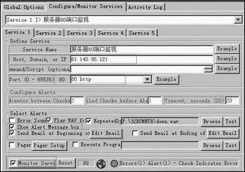 网络设备,确保其正常工作。但是,由于还有其他工作,网管员不可能一步不离地守在服务器旁,随时监视其工作状态。那么,当网管员处于其他位置时,如何才能在服务器出现问题时及时得到相关信息并进行维护呢?笔者搭配使用“32bit Service Monitor”(下载地址:http://www.viphot.com/SoftView/SoftView_6701.html)和“邮件快递”(下载地址:http://soft.xylxw.net/soft/2143.htm)两款软件,有效地解决了以上问题。服务监视器设置我们在服务器上安装并运行“32bit Service Monitor”,在“32bit Service Monitor”的主界面中选择“Configure /Monitor Services”标签,然后选择“Service 1”。假设我们要对服务器的Web服务进行监视,就在“Service 1”标签下进行相应配置(如图1所示):在“Host,Domain,or IP”栏中输入服务器的IP地址;在“Port(0—65535)”处输入要监视的端口号(例如我们要监视Web服务,就选择80端口);在“Select Alerts”处选择当服务器发生故障时,系统以何种方式通知我们(如播放音乐)。使用以上配置的前提条件是网管员工作的位置和服务器相距不远,否则就只能通过W-Mail方式来通知了:钩选“Send E-mail at Beginning of”选项,然后点击[Edit E-mail]按钮,对系统发送邮件的各项参数进行设置。